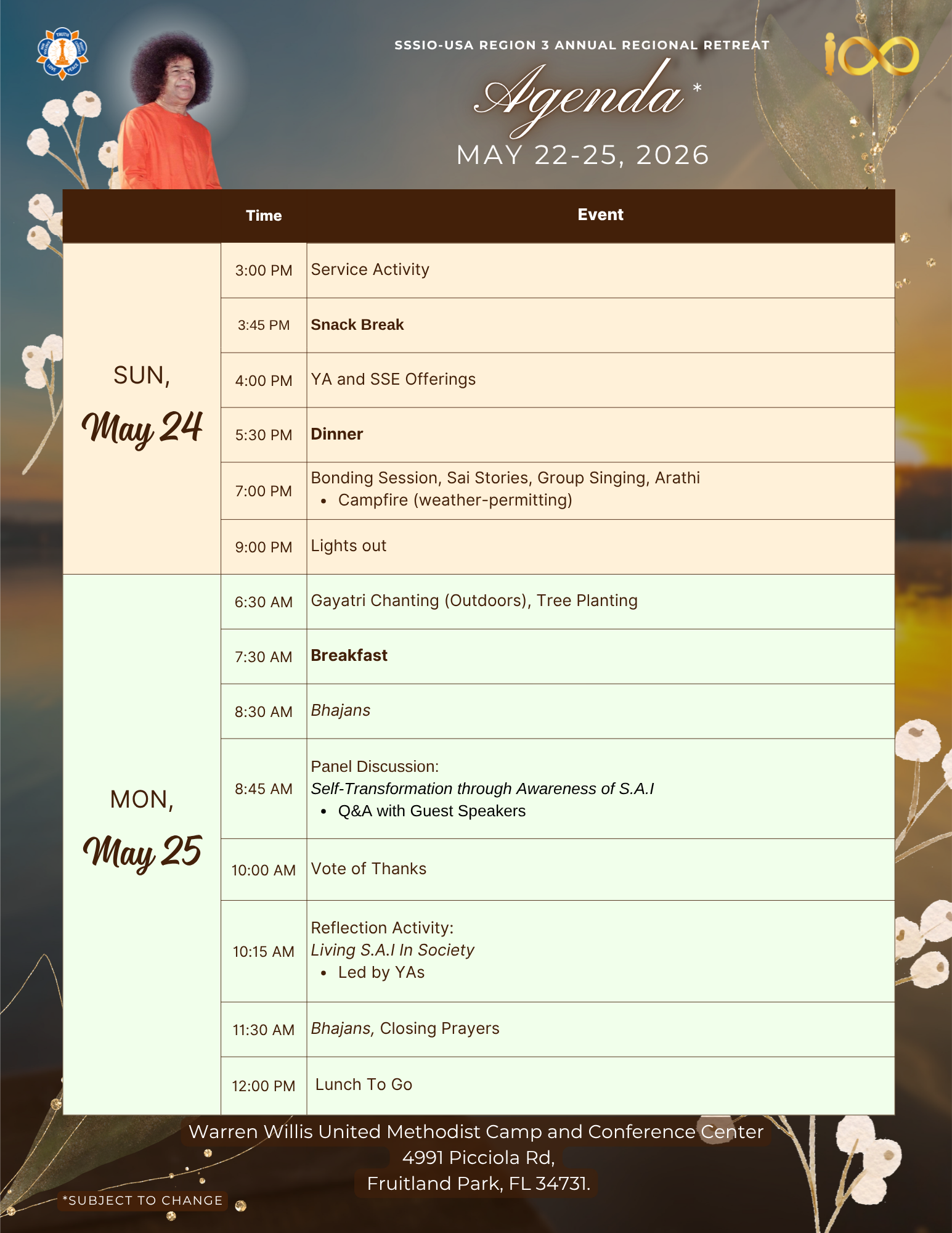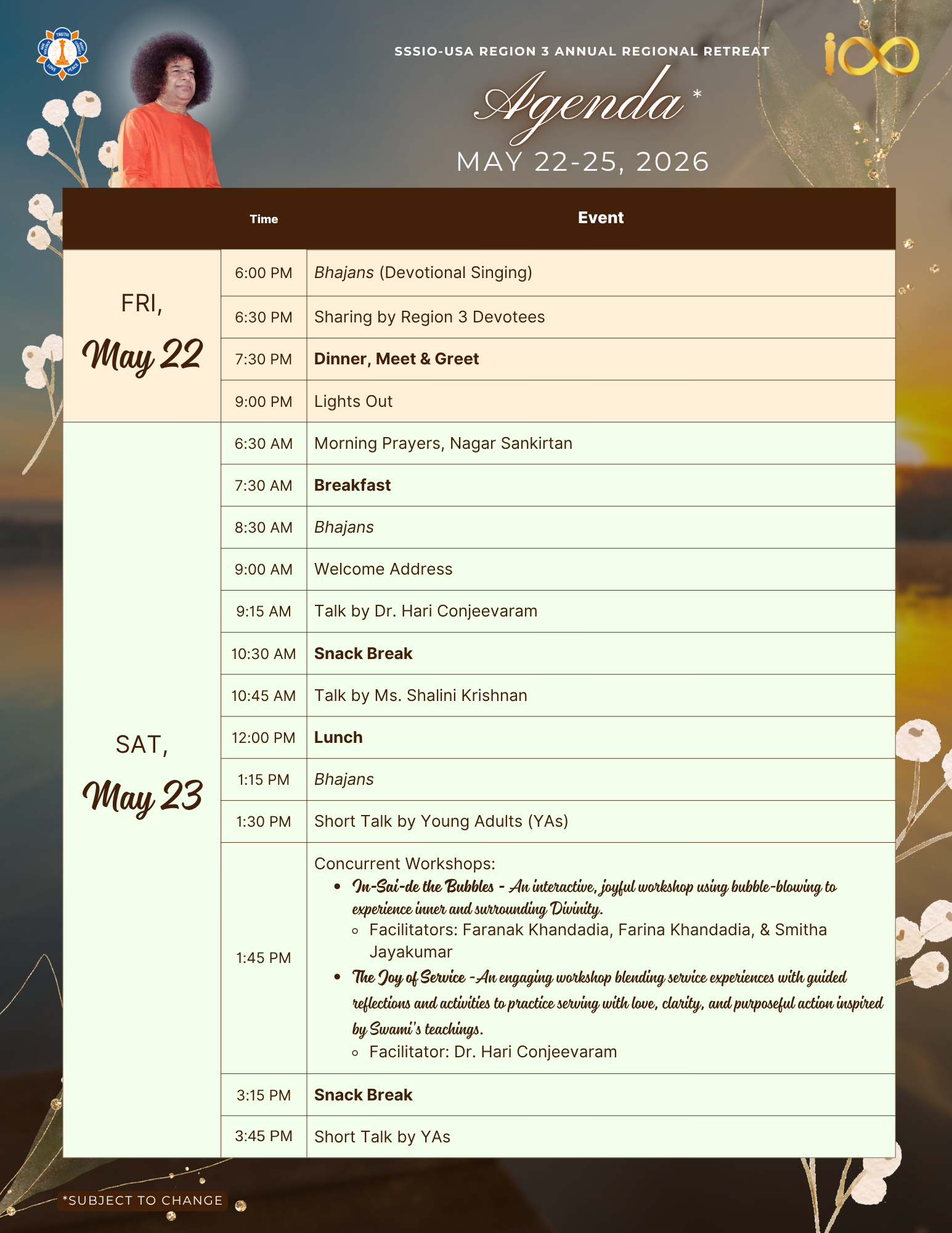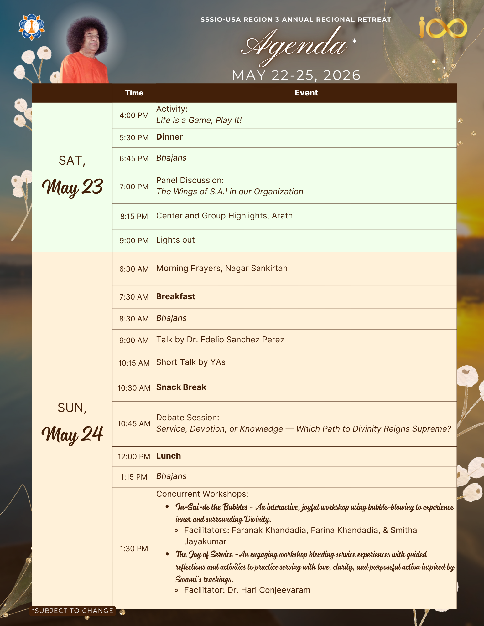 With the divine grace and blessings of Bhagawan Sri Sathya Sai Baba, SSSIO-USA Region 3 is blessed to host the Regional Retreat, “Awareness of SAI” during Memorial Day Weekend, May 22nd – 25th, 2026 in sunny Florida: